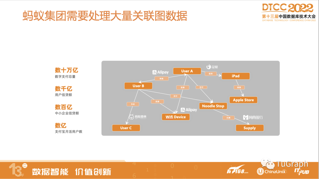 蚂蚁自己开发了一套图计算系统TuGraph,既能解决图数据的存储问题,也能解决流式计算、离线计算和图学习的问题。目前,超过100个业务线和300多个场景都在使用这套系统。这套系统在2021年获得了世界互联网大会领先科技成果奖。
