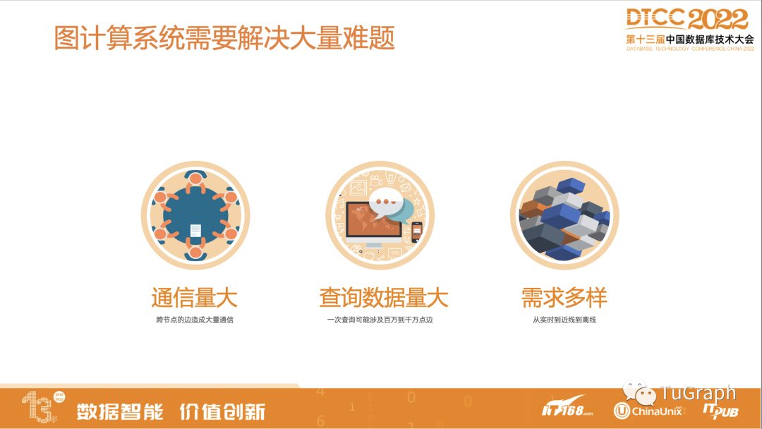 在建立图计算系统的过程中,我们也遇到了许多挑战。为了分担较大的通信量,需要将图数据分布到多台机器上,但这会导致边的信息在不同机器之间传递,造成大量的通信。此外,单次查询所涉及的数据量也比较大,例如五跳查询涉及的点数就已达到10的五次方,图中还存在一些非常大的点。同时,用户对图计算系统的需求也十分多样,既有快速查询的需求,也有对复杂算法(如社区发现)的需求,单一系统很难满足这些不同的需求。