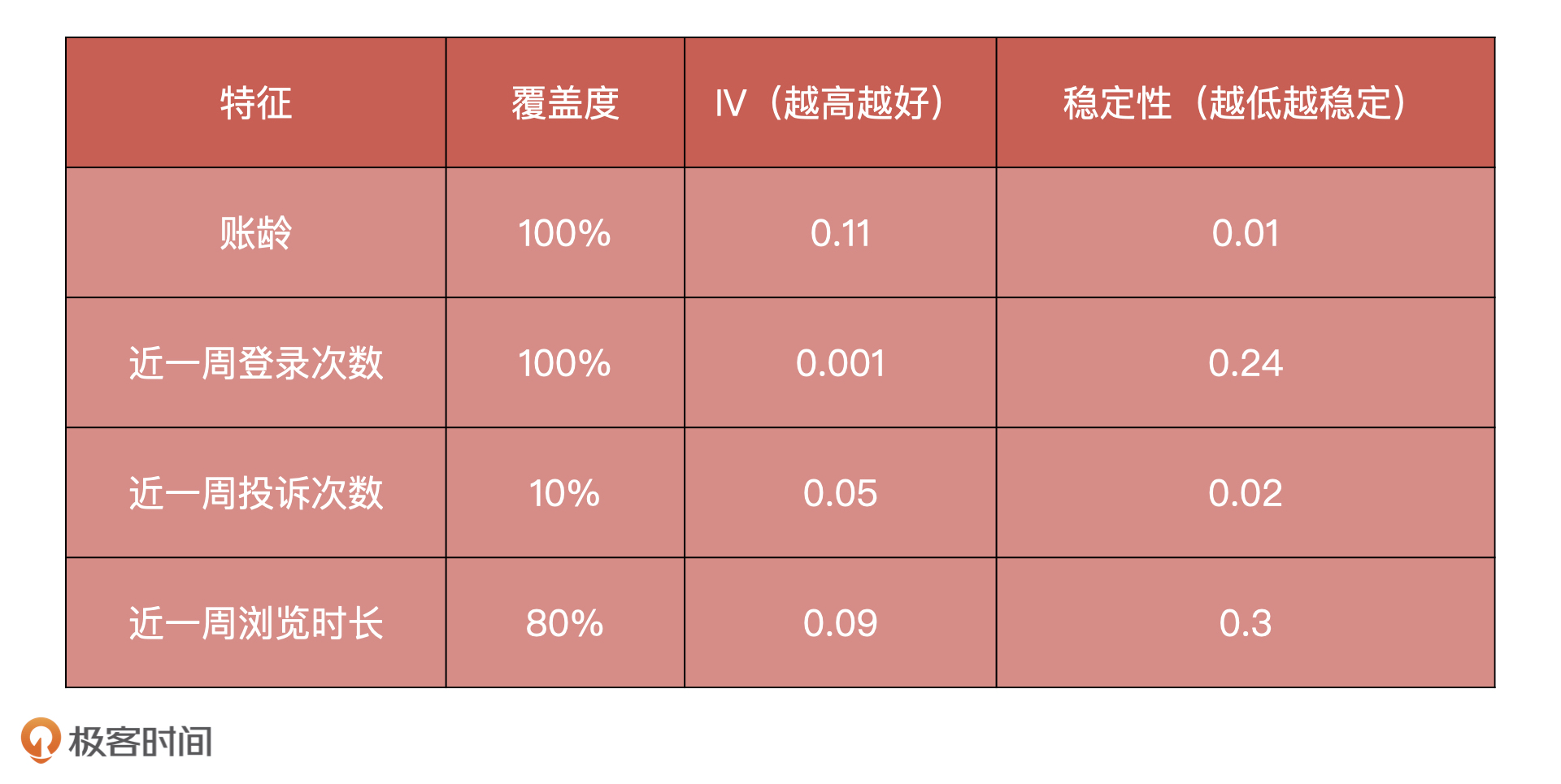 首先去掉覆盖度过低的投诉次数,因为这个特征覆盖的人群很少,从经验上来讲,如果特征覆盖度小于 50% 的话,我们就不会使用这个特征了。然后去掉 IV 值过低的登录次数,IV 值指的是信息贡献度,表示了特征对这个模型有多少贡献,那简单来说,就是这个特征有多重要。在用户流失项目中,如果 IV 小于 0.001 的话,我们就不会使用这个特征了。最后去掉稳定性过低的浏览时长,剩下的就是我们可以入模型的特征变量了。