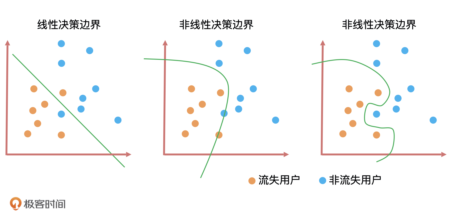 更具体点,在我们的例子中,模型训练的目标就是为了预测用户是否为流失用户,模型训练就是在已知用户数据中通过算法找到一个决策边界,然后在这条决策边界上,模型的拟合和泛化能力都能达到最好,也就是说,在训练集和测试集上对流失用户预测准确率都很高。