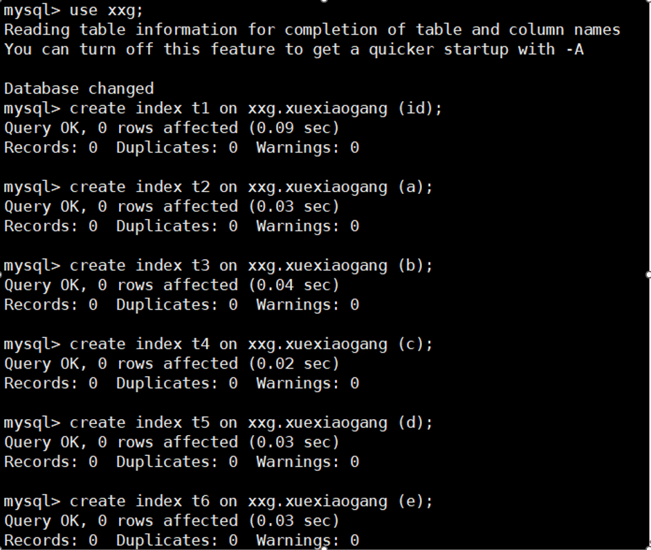 mysql> create table xxg.xuexiaogang (id