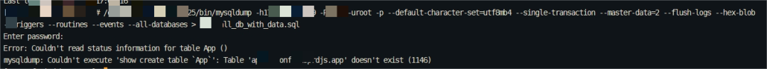 通过第三节的场景模拟可以推测出,应用人员其实本意是要将库下的数据全部删除掉,但是因 MySQL 的环境因素,以及运维人员的操作不当,导致遗留下.frm文件未被清理掉。那么我们可以直接跳过相关库的备份,从而绕过此报错。