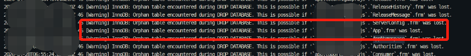 在 lower_case_table_names = 1 环境下,下发了 DROP database 操作。由于操作系统 Linux 是大小写敏感的,MySQL 使用小写字母去匹配需要删除的库表文件,而.frm文件名中包含了大写,无法匹配,导致文件残留(mysql-error.log 此时记录,在删库过程中,无法找到对应.frm文件)。