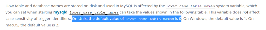 根据下面截图信息可以确定 Unix 平台上,lower_case_table_names 默认 = 0 ,是大小写敏感的。