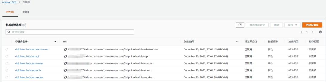 构建 DolphinScheduler 自定义镜像 为了后续基于官方开源镜像做定制化,使用 AWS ECR 进行镜像管理,分别创建 DolphinScheduler 镜像 ECR 仓库,将官方镜像 push 上去(参考:https://docs.aws.amazon.com/zh_cn/AmazonECR/latest/userguide/docker-push-ecr-image.html)。本文使用 DolphinScheduler 3.1.2版本。