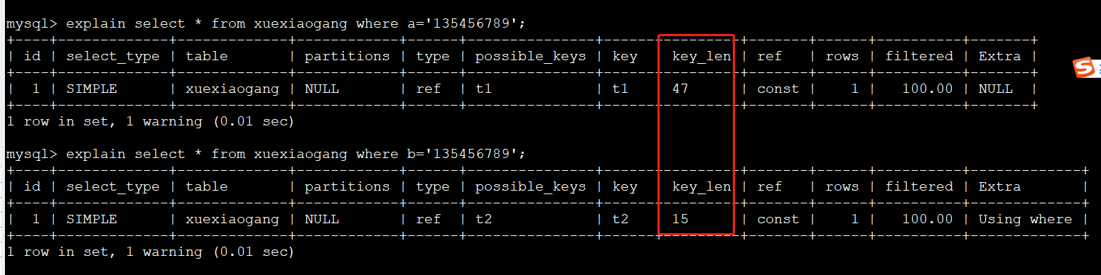 然后我们看看结果,如图4.通过上一篇的key_len的知识大家应该知道这个是怎么算的了。 可以看到部分索引的key_len是全字段索引的1/3左右。那么,继续我们刚才说的。如果我们假设有一个表50个字段,每个字段大小一样,查一个字段相当于一个表的1/50.那么这样的部分索引等于又在1/50的基础上继续缩小,那么又会得到更大的提升。