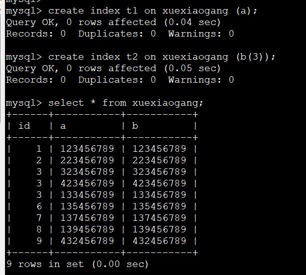 然后给a和b分别建立索引。如图3.可能t2索引这样的写法大家觉得有点非主流。对就是不一样。他意思是只为这个字段前3个字符建立索引。为什么?因为后面的一样,没必要去浪费这些存储了。