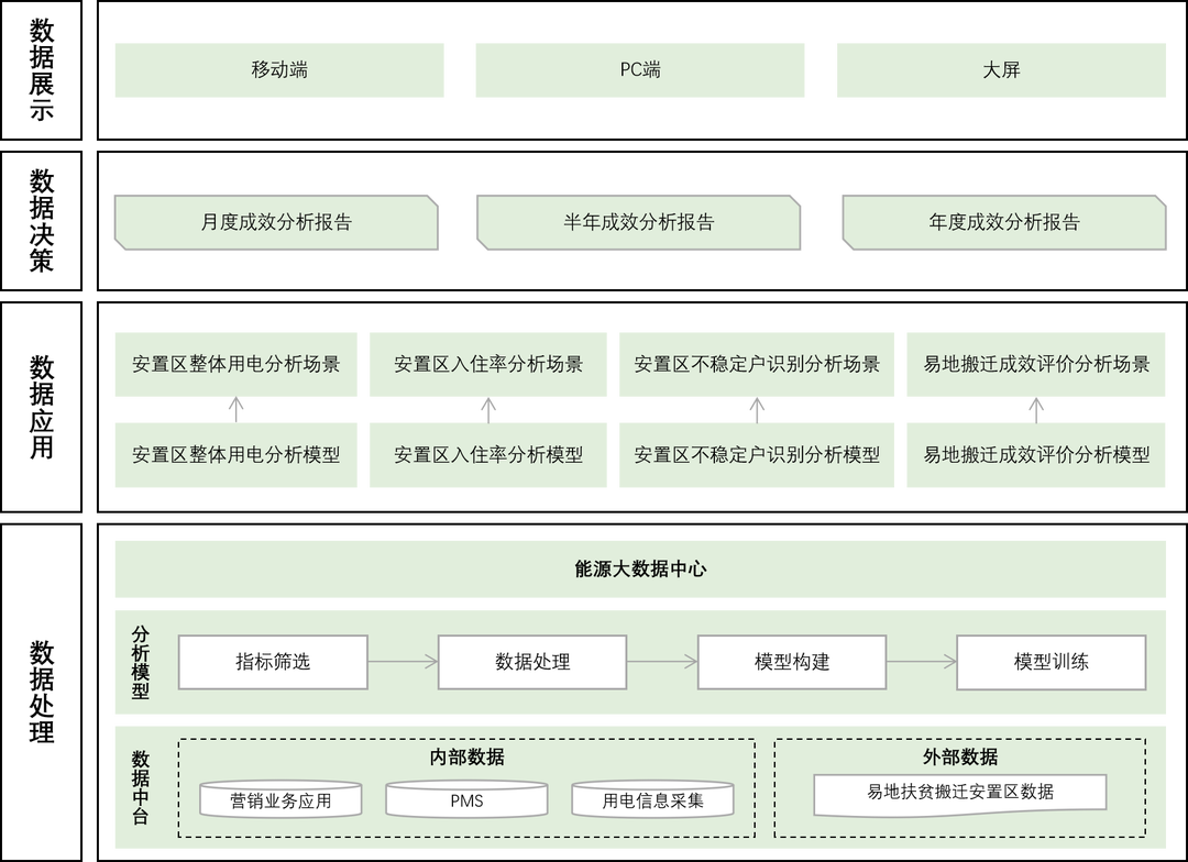 依托柏睿数据完全自主研发的分析型数据库产品体系和人工智能产品体系,该国家电网省级电力公司以电力大数据为主,外部数据为辅,构建电力大数据分析模型和分析场景,实现了易地搬迁成效评价分析、安置区整体用电分析、入住率分析、不稳定户识别分析4大分析场景的全方位评价,直观展示了各区域易地扶贫搬迁的整体情况,并定期形成易地搬迁成效分析报告,深度挖掘电力数据的社会化应用价值,为乡村振兴局等相关政府部门提供智慧、高效的决策辅助,不断提升扶贫工作成效。