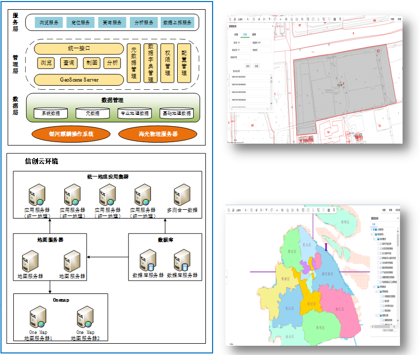 在上海市规划资源统一地理信息服务平台项目中,搭载GeoScene服务器软件(Linux版)以及GeoScene大数据分析软件+曙光服务器(海光CPU7280)+银河麒麟高级服务器操作系统V10版。以统一地理信息服务平台是以规划和国土资源统一空间数据为基础,为各个业务应用系统提供数据服务、地理信息服务功能和二次开发接口,并提供有效的运行安全服务机制,确保服务平台可持续运行。
