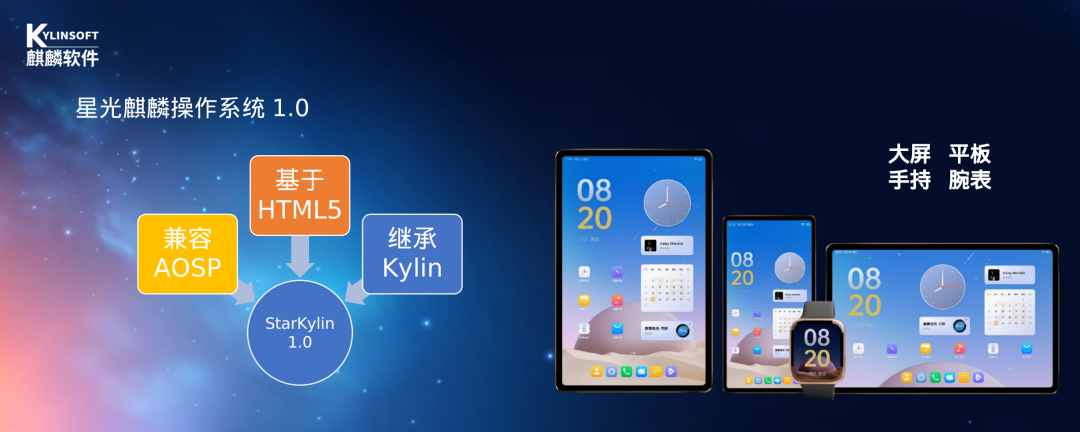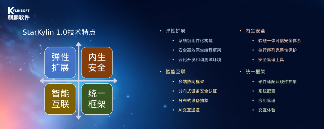 从硬件适配、应用兼容、可控升级这三个困扰操作系统产业界的“三座大山”入手,星光麒麟操作系统应运而生。星光麒麟操作系统1.0延续了星光麒麟操作系统“弹性扩展”、“内生安全”、“智能互联”和“统一框架”四大特性,攻克了一系列关键技术。例如,全系统采用组件化设计,充分发挥了H5优势;实现桌面端的软硬一体可信安全体系,完成可信启动支持;智能互联方面,做到了智联相机、智联记事本两个多端协同应用,积累了支持分布式设备安全认证、互连互通和数据安全传输的SDK接口,并为AI交互体系构建SDK;实现了安卓应用在H5桌面上的融合,完成了统一框架上的准备。星光麒麟操作系统1.0已全面适配、覆盖国产主流移动芯片,基于Linux+H5技术路线,同时融合了AOSP软件栈来支持安卓应用生态。