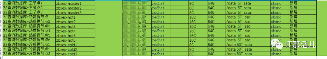 3主节点:内存64G,8核,5T的机械硬盘; 3热数据节点:内存64G,16核,5T的固态硬盘; 3冷数据节点:内存64G,8核,50T的机械硬盘。