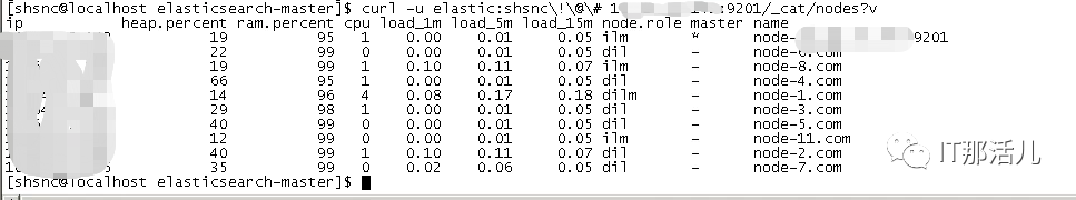 ip: 集群中节点的 ip 地址; Heap.perecnt:堆内存的占用百分比; ram.percent:总内存的占用百分比,其实这个不是很准确,因为 buff/cache 和 available 也被当作使用内存; cpu:cpu 占用百分比; load_1m:1 分钟内 cpu 负载; load_5m:5 分钟内 cpu 负载; load_15m:15 分钟内 cpu 负载; node.role:dilm 分别表示 m表示master节点、d表示data节点、i表示ingest节点、l表示机器学习节点; master:* 代表是 master 节点,- 代表普通节点; name:节点的名称。