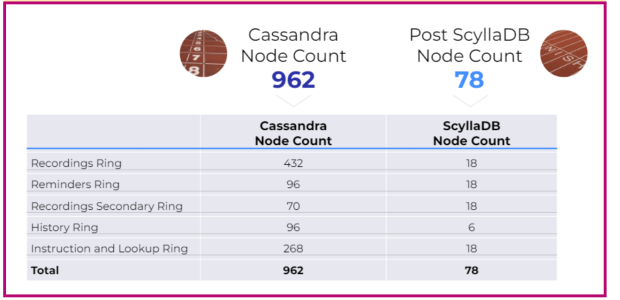 由于 ScyllaDB 的架构旨在充分利用现代基础架构,允许它向上扩展和向外扩展一样多,Comcast 能够用仅 78 个 ScyllaDB 节点替换 962 个 Cassandra 节点。