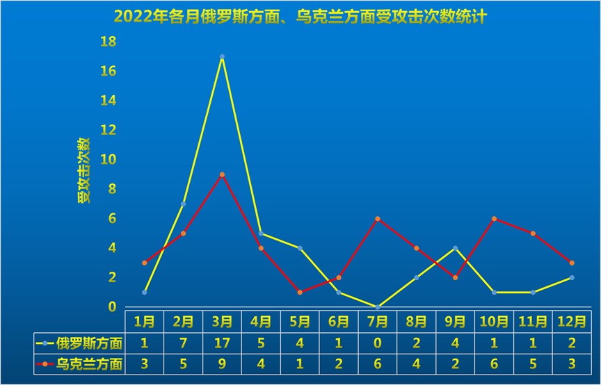 图2 2022年各月俄罗斯方面、乌克兰方面受攻击次数统计
