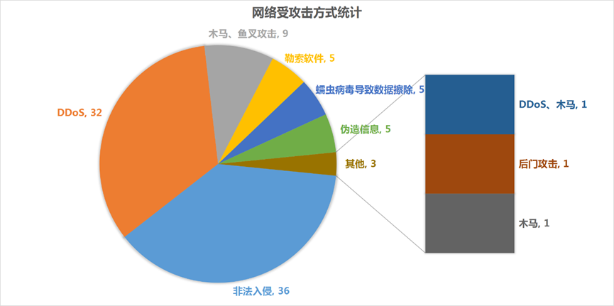 如图5所示,是俄乌双方受攻击的方式统计,从中可以发现,黑客组织使用最多的攻击方式是非法入侵、DDoS。