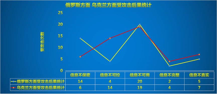 如图7所示,是俄乌双方网络攻击效果统计,可以发现,网络攻击导致信息不可用、信息不保密、信息不可控的情况占绝大多数。