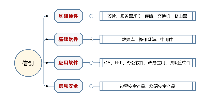 信创,即信息技术应用创新产业,包含了从 IT 底层的基础软硬件到上层应用软件的全产业链。一般来说,信创包括基础硬件、基础软件、应用软件、信息安全四大板块。