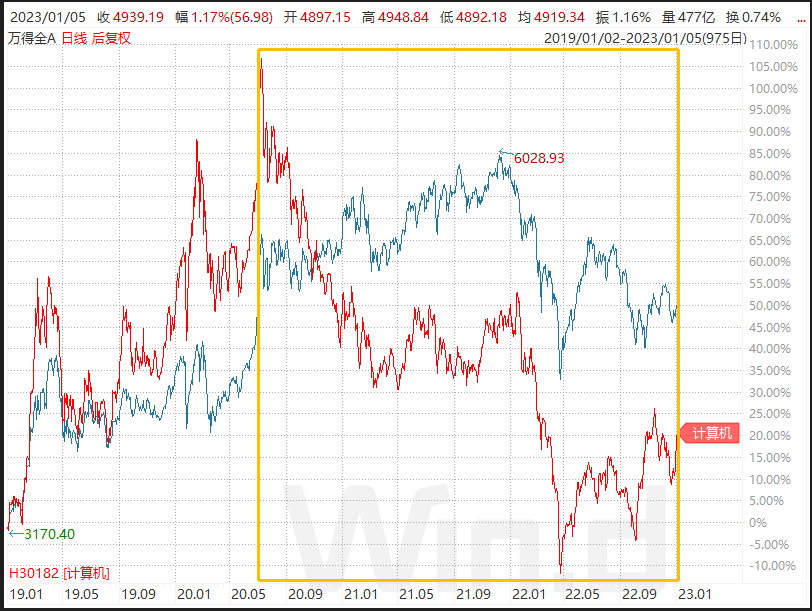 2022 年,地缘政治风险加剧、美联储货币政策收紧、国内疫情不断反复等因素导致 A 股整体呈现下跌行情。截至22年末,计算机(申万)跌幅达 25.47%,较万得全A(-18.66%)更弱,位居31个申万一级行业指数跌幅第四。(数据来自wind,市场有风险,投资需谨慎,历史业绩不代表未来)