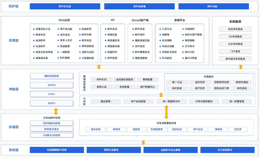方案以中国电子云平台为安全底座、以麒麟邮件系统为核心应用、以中电蓝信为安全协同平台,满足各行业的安全创新需求和自主创新的目标。