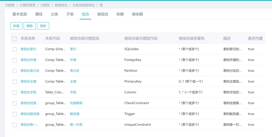描述组合端模型由被组合端模型所组成,如:物理表模型是由字段模型组成,报表是由报表字段组成,主题域由维表和主题集组成。元数据的组合关系其实就是包含关系,比如表下面有字段、主键,那么表就是包含字段和主键的。