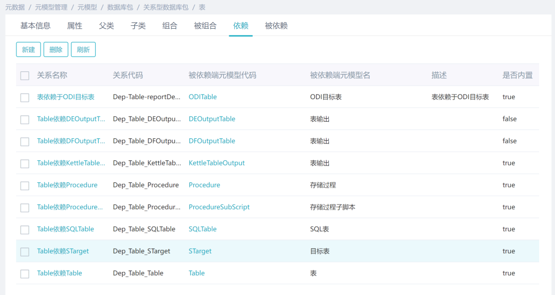 描述模型与模型之间的引用关联关系,如:报表用到了主题表,则报表依赖主题表;视图用户到表,则视图依赖于表。元数据的依赖关系类似于引用的关系,比如视图可以根据表和视图创建,那么视图就是依赖于表和视图的。