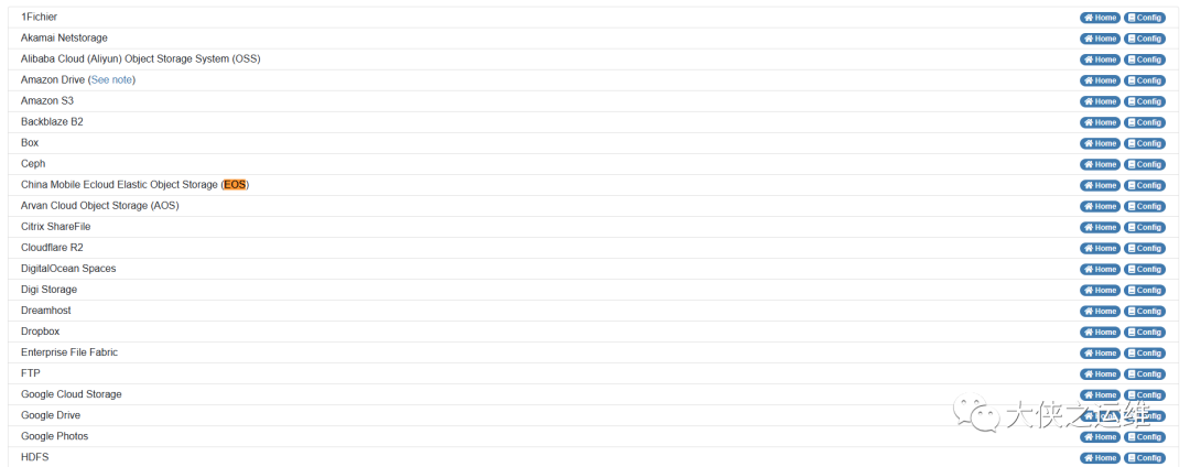 在官方文档也提供了具体支持的云存储列表,还有具体的配置文件参考样例: