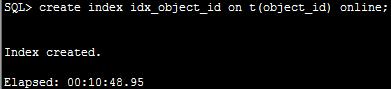 由于加了online,更新操作可以完成,但回去会话1查看,索引建立被阻塞,不能完成,直到更新事务结束。