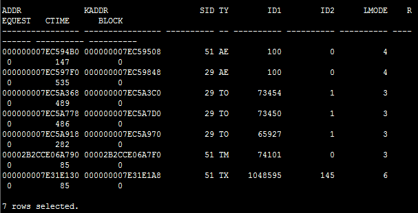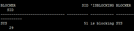 SQL> select *+no_merge(a) no_merge(b) */ (select username from v$session where sid=a.sid) blocker,a.sid,'is blocking', (select username from v$session where sid=b.sid) blocker,b.sid from v$lock a,v$lock b where a.block=1 and b.request>0 and a.id1=b.id1 and a.id2=b.id2;