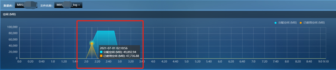 等待资源是LOG_MANAGER,说明数据库MIIS****的日志文件在发生变化。转到数据库空间页面,发现日志文件从2点钟开始增长,2点20时增长到90GB,3点时降到初始值(因为3点有自动收缩日志文件的计划任务)。