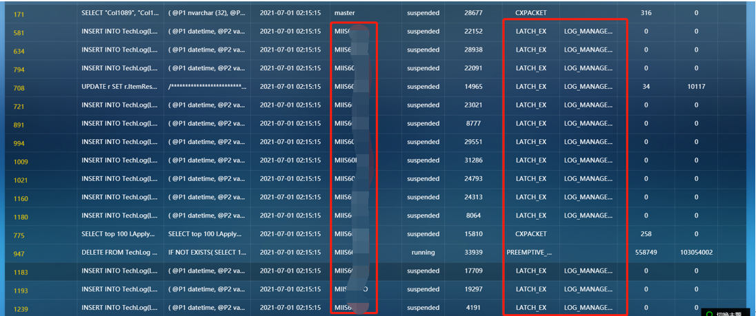转到活动会话原始数据页面,看到大量会话都在等待,等待类型是LATCH_EX,等待资源是LOG_MANAGER,数据库都是MIIS****。SQL语句是INSERT、UPDATE、DELETE等写入的语句。