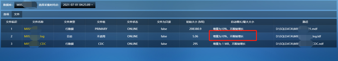 从2点钟开始日志文件频繁自动增长,日志文件的自动增长增量设置为10%,随着日志文件的空间越来越大,每次增加会达到几GB甚至更多,基于磁盘的性能,最少造成十几秒的性能抖动。