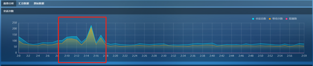 登录SQL专家云,进入活动会话的趋势分析页面,下钻到2点钟一个小时内的数据,看到每分钟的等待数都在100左右,2点15分时达到200。
