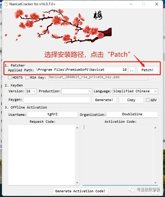 9、【1、Patcher】这一栏选择第3步软件安装的路径,然后点击【Patch】