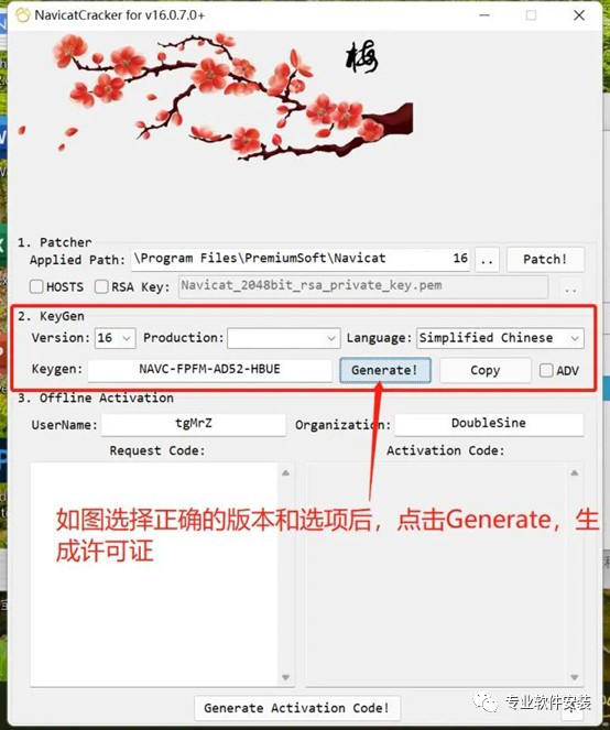 10、【2、KeyGen】这一栏【Version】选择软件版本;【Production】选择软件产品;【Language】选择软件语言。点击“Gererate”生成许可证序号;