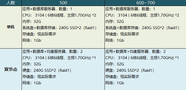照10%的并发估算,考虑3年数据增长规划,500-700人的配置建议如下表: