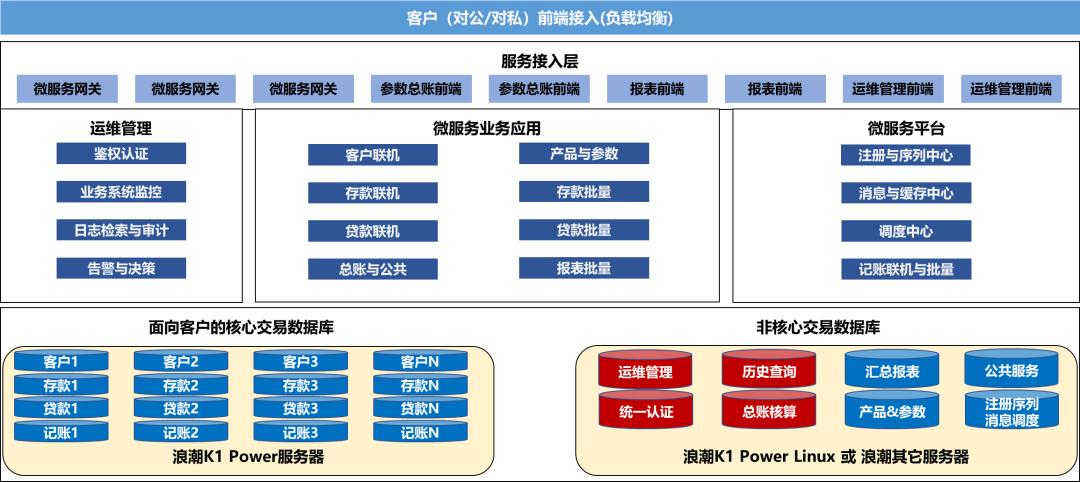 当前,银行核心应用系统多采用微服务框架与模块化技术架构,在浪潮K1 Power上,银行核心业务可采用集中和微服务并存的方式进行部署,前置应用服务模块和后台数据库系统均实现了完全解耦,既保证了业务的敏捷响应,又保证后端核心交易系统的稳定可靠。