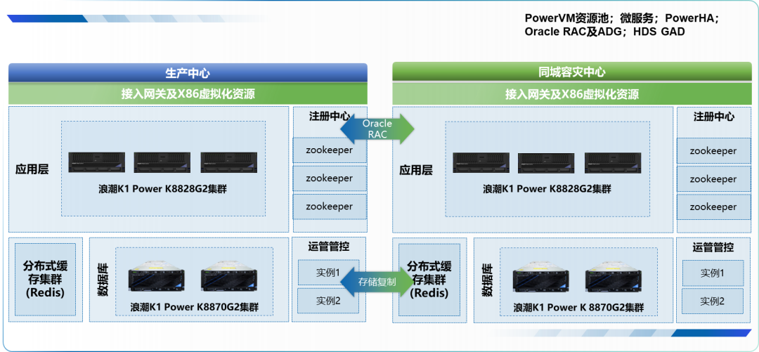 该客户核心业务系统采用浪潮K1 Power服务器作为承载核心核算系统的数据库服务器,部署Oracle RAC,其他应用服务及数据库则采用了其他类型服务器,建设传统核心和国产新核心互备运行的系统架构。通过微服务应用,实现了同城双活,数据库同城互备模式,既保证了数据安全的要求,也满足了业务灵活创新的需求。