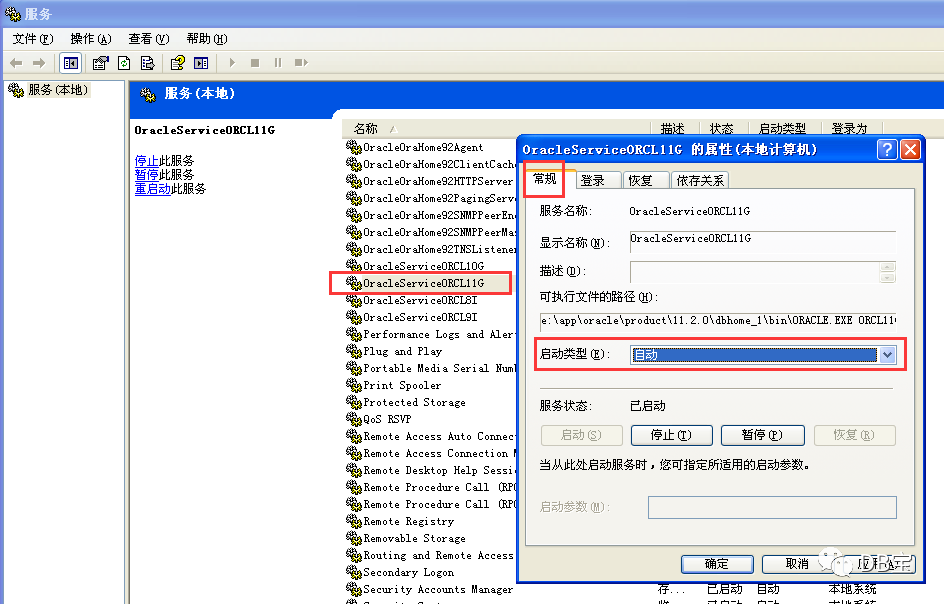 在Windows中,可以修改“我的电脑-->管理-->服务-->OracleService$ORACLE_SID”,或直接使用Win+R键打开运行窗口,输入services.msc即可打开服务,找到相应的Oracle服务,然后将其属性中的启动类型修改成自动。一般在Windows系统上安装完后会自动设置成自动。
