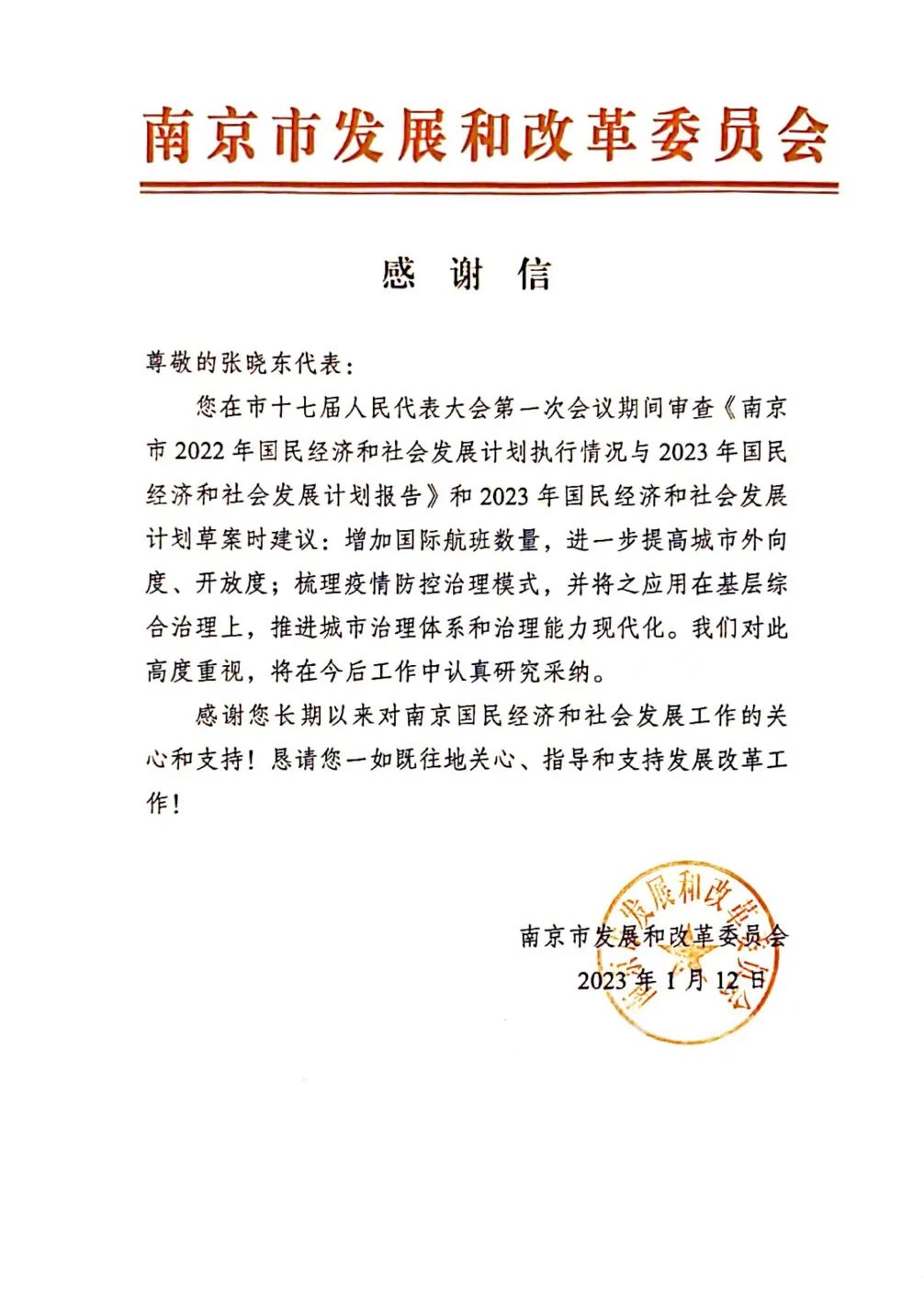 会议期间张晓东院长提出“增加国际航班数量,进一步提高城市外向度、开放度;梳理疫情防控治理模式,并将之应用在基层综合治理上,推举城市治理体系和治理能力现代化”以及结合敏捷智库的专业调研提出的“以'数业化'为主线,全面建设中国式现代化典范城市”、“完善数据立法制度建设,激活数据要素潜能”、“深化数据赋能,打造南京'无证明城市'”等建议,得到了人大及南京市有关部门的重视,并将在今后工作中认真研究采纳。