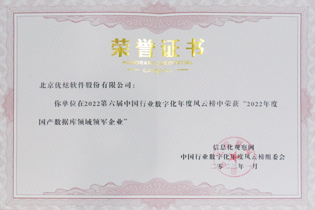 近日,“2022第六届中国行业数字化年度风云榜”评选结果正式公布。风云榜推优榜单中,优炫软件荣获“2022年度国产数据库领军企业"。同时,面向银行绩效考核系统中国产数据库应用创新项目作为优秀项目案例还入选《2022中国数字化转型优秀方案集》。