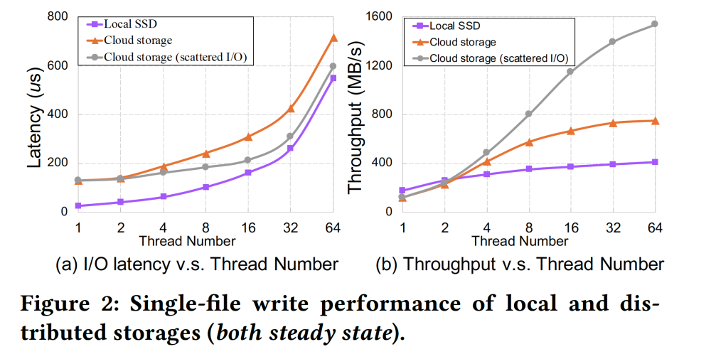 左图是 I/O 延迟与工作线程的关系,可以看到,本地 SSD 的 I/O 延迟远优于云存储;