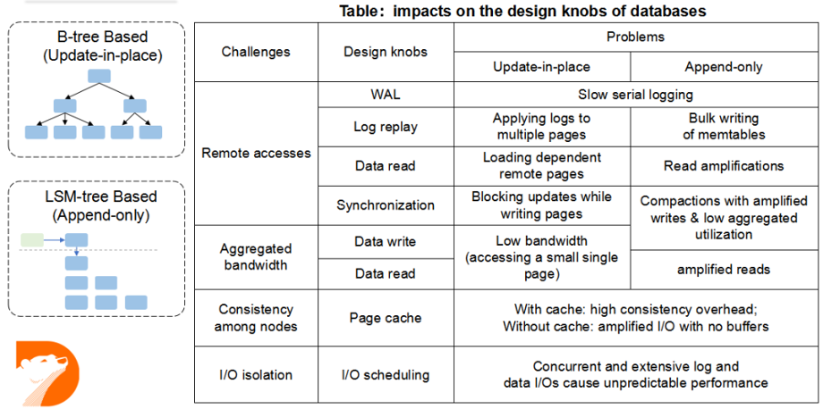 下图中的表格总结了上述挑战对数据库设计的影响。对比基于 B-tree 结构(Update-in-place)和基于LSM-tree 结构(Append-only),其中有共性问题,如 WAL 路径写入变慢、共享存储(分布式文件系统)cache 一致性代价等;也有个性问题,如 B-tree 结构在独占资源情况下做远程 I/O、远程加剧 I/O LSM-tree 读放大影响等。