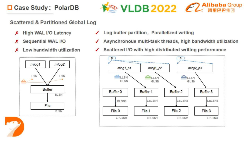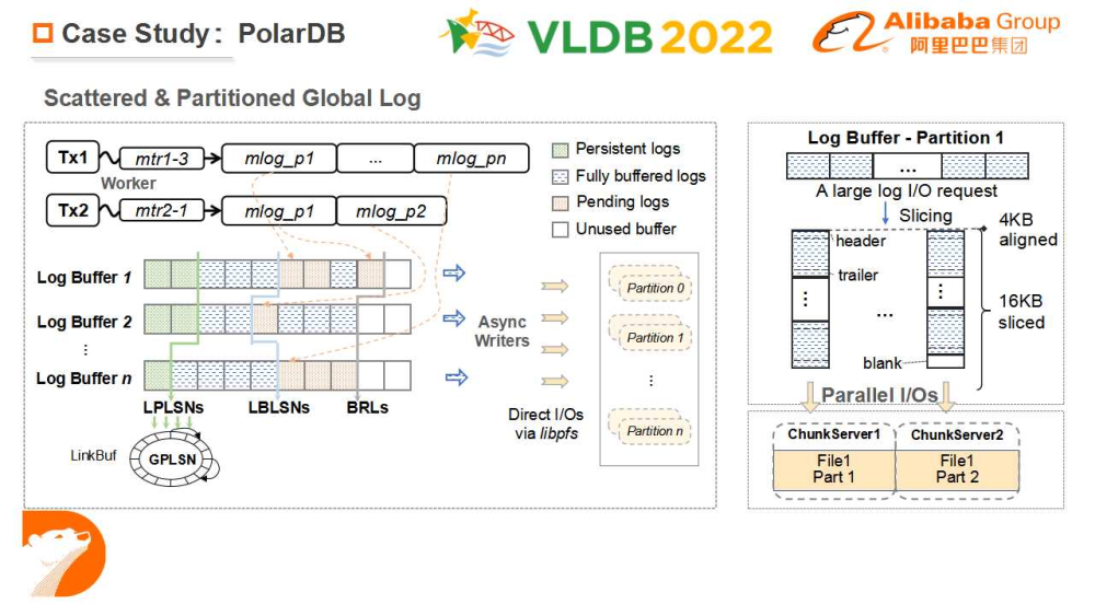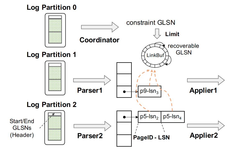 将 redo 的日志缓冲区按其修改的 page 进行分片(partition),分别写入不同的文件中,支持并发写 log,从而在适合并发写入的分布式文件系统上的获得写入性能优势;