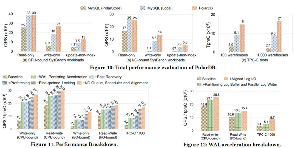 将 MySQL 分别运行在 PolarStore 和本地盘,以及优化后的 PolarDB 进行性能对比,从下面 Figure 10图中可以看到,优化后的 PolarDB 在 CPU-bound, I/O-bound sysbench, TPC-C 等各个场景下,都表现出明显的性能优势。