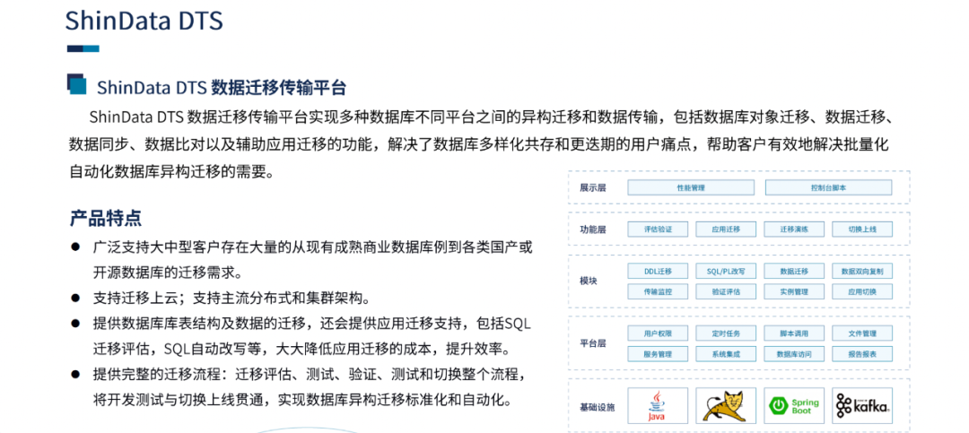 另外,平台还有一个模块叫做 ShinData DTS 数据传输迁移平台。在企业上线新的数据库时,必然会面临着数据库异构迁移的问题,包括如何迁移评估、SQL 如何改写等等,并且企业希望迁移过程是不停机、保证数据实时复制的。