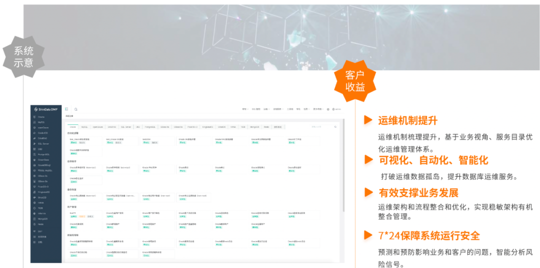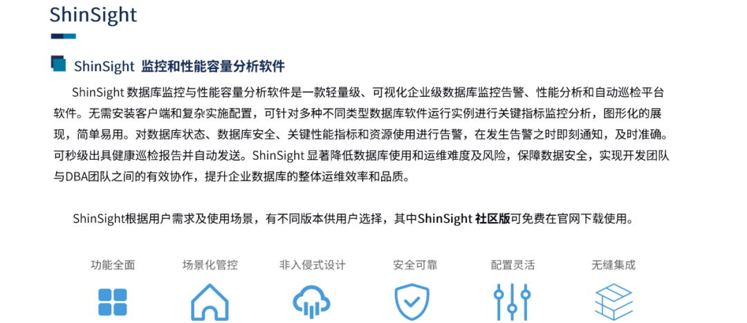 此外,我们还有一个用于监控和性能容量分析的软件ShinSight,它在DMP里对应的其实是一个完整的性能容量分析的模块。但是有一些偏中小规模的数据库运维需求,他们更多的是希望把整个数据库监控起来,数据库出现问题能够及时发现,即能够进行自动化的监控巡检。所以我们也推出了这样一个