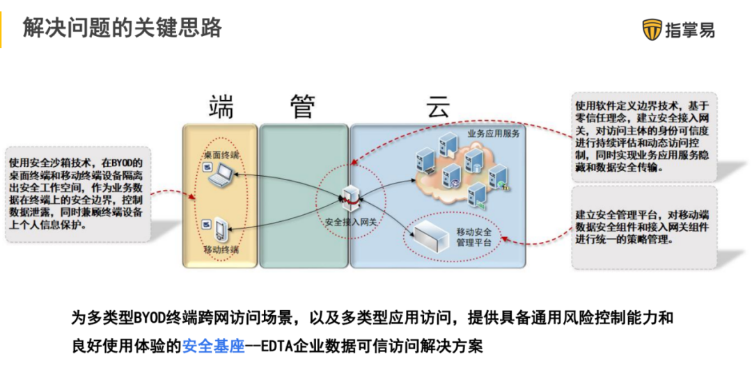 指掌易EDTA方案解决问题的关键思路是,使用安全沙箱技术,在BYOD的桌面终端和移动终端设备隔离出安全工作空间,作为业务数据在终端上的安全边界,控制数据泄露,同时兼顾终端设备上个人信息保护。