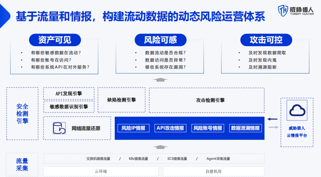因此,需要基于流量和情报,构建流动数据的动态风险运营体系。威胁猎人云情报平台可以做到资产可见、风险可感、攻击可控,其安全监测引擎可以做到API发现、敏感数据识别、缺陷监测和攻击监测。