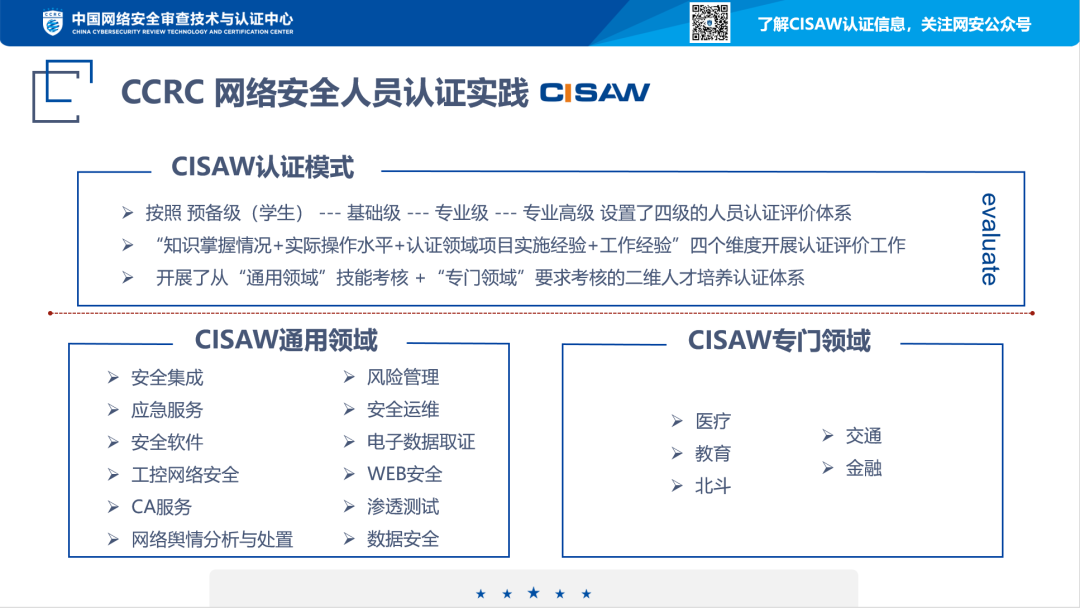 CCRC依据ISO 17024的标准要求开展了信息安全保障人员认证活动,包括考试的认证申请、评价、决定、持续教育、持续监督。其分为预备级、基础级、专业级和专业高级四个级别,预备级主要面向学生、在校生,走入社会后的在职人员可以考取基础级、专业级和专业高级三个级别,此认证并不是以一次培训和考试为目的,主要是检测从业人员的知识、技能和操作水平。