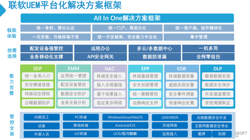 联软UEM平台化解决方案具备基于零信任理念的统一端点管理思路,其内包含可信身份、可信接入、可信设备、可信应用、可信数据。